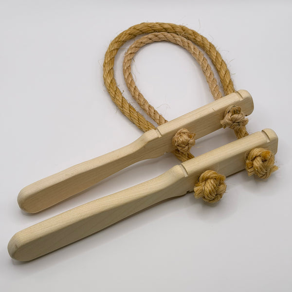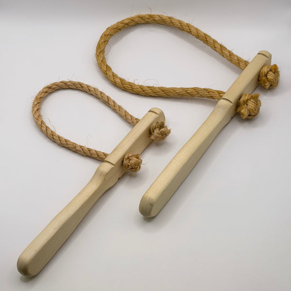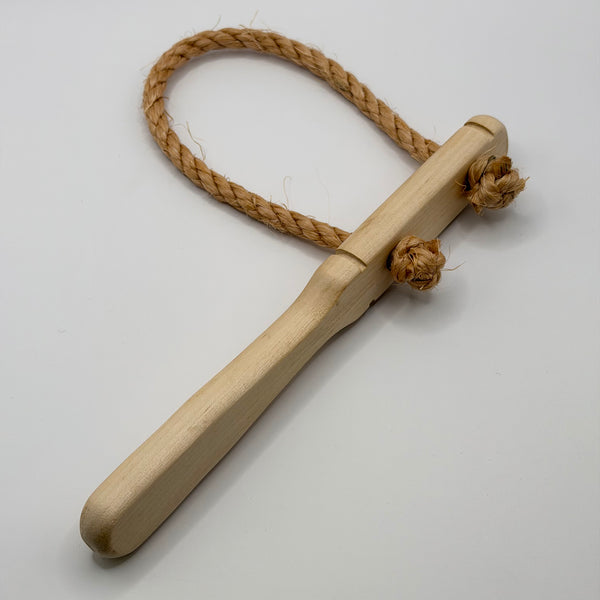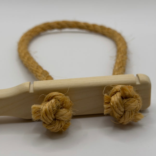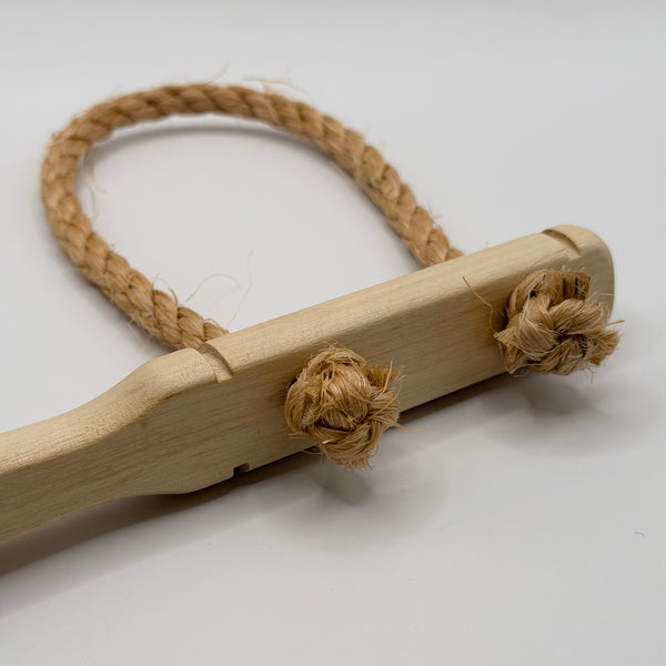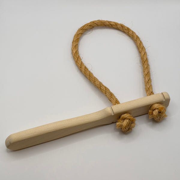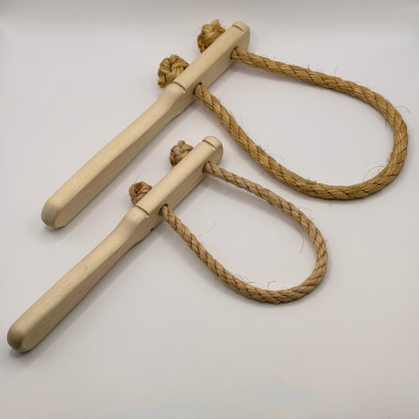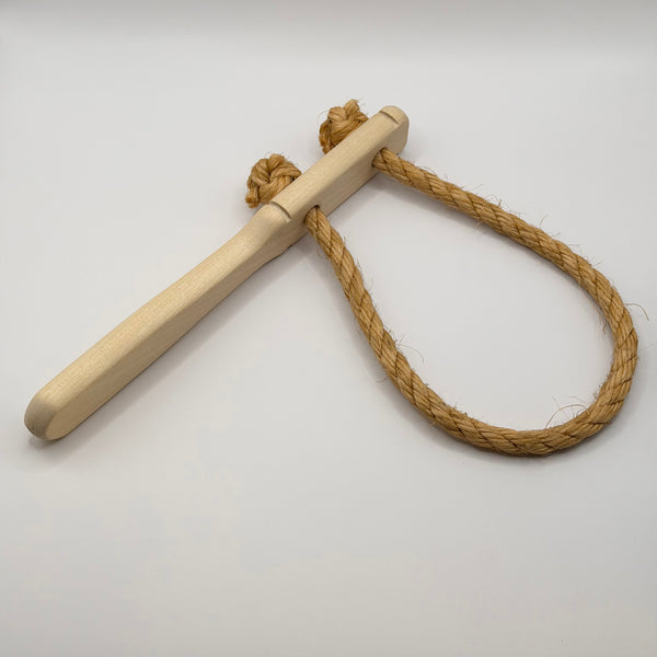 Brems med handtag av obehandlat trä och rep av naturfiber (sisal). Nytillverkad, svenska försvarets modell. Två storlekar:Handtag 22,5 cm, ögla ca 30 cm invändigt. Handtag 25 cm, ögla ca 40 cm invändigt.